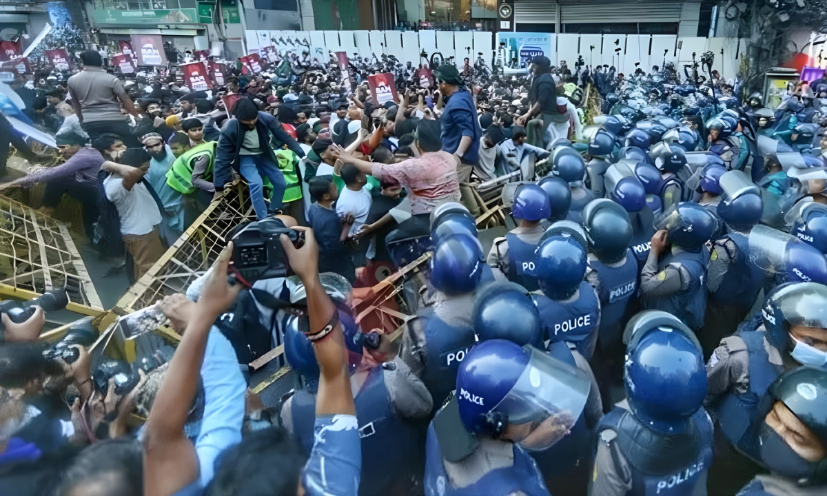 ছবি: জুলাই ঐক্যের ‘মার্চ টু ইন্ডিয়ান হাইকমিশন’ কর্মসূচিতে পুলিশের বাধা। ছবি: সংগৃহীত