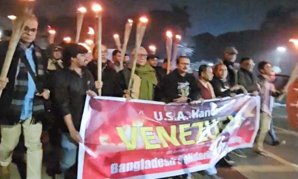 ভেনেজুয়েলার রাজধানী কারাকাসে যুক্তরাষ্ট্রের হামলা ও দেশটির প্রেসিডেন্ট নিকোলাস মাদুরোকে সস্ত্রীক ‘আটকের’ প্রতিবাদে ঢাকায় মশাল মিছিল হয়েছে। শনিবার (৩ জানুয়ারি) সন্ধ্যা ৬টার দিকে রাজধানীর পুরানা পল্টন মোড় এলাকায় এ মিছিল অনুষ্ঠিত হয়।