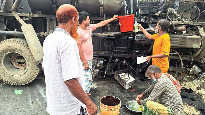দুর্ঘটনার পর স্থানীয় লোকজন ঘটনাস্থলে ভিড় করেন। তাদের মধ্যে কয়েকজন তেলের ট্যাংক থেকে ঝরতে থাকা ডিজেল বালতি, পলিথিন ও বিভিন্ন পাত্রে সংগ্রহ করে নিয়ে যান। এ দৃশ্য দেখে শুভুল্যা গ্রামের বাসচালক রুবেল মিয়া দ্রুত ঘটনাস্থলে ছুটে আসেন। তিনি একটি লৌহদণ্ড দিয়ে ট্যাংকের মুচড়ে যাওয়া অংশ সোজা করার চেষ্টা করেন এবং পরে সাবান ব্যবহার করে তেল পড়া বন্ধ করার চেষ্টা করেন। এতে কিছুটা সফলতাও পান তিনি।