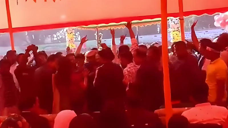 মঙ্গলবার (১৬ ডিসেম্বর) সকাল সাড়ে ৯টার দিকে উপজেলা পরিষদ প্রাঙ্গণে কুচকাওয়াজ অনুষ্ঠানের আগে একটি মিছিলে বিএনপির নেতাকর্মীরা ‘স্বাধীনতার ঘোষক জিয়া—লও লও লও সালাম’ স্লোগান দিতে থাকেন। এ সময় মঞ্চের একপাশ থেকে ইউএনও কাজী নাহিদ ইভা রাষ্ট্রীয় অনুষ্ঠানে দলীয় স্লোগান না দেওয়ার জন্য নির্দেশ দেন।