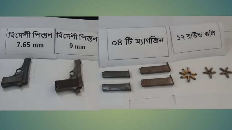 উদ্ধারকৃত অস্ত্রের মধ্যে রয়েছে একটি ৭.৬৫ এমএম বোরের ও একটি ৯ এমএম বোরের বিদেশি পিস্তল। এছাড়াও দুটি ম্যাগাজিনসহ মোট ১৭ রাউন্ড তাজা গুলি উদ্ধার করা হয়।
