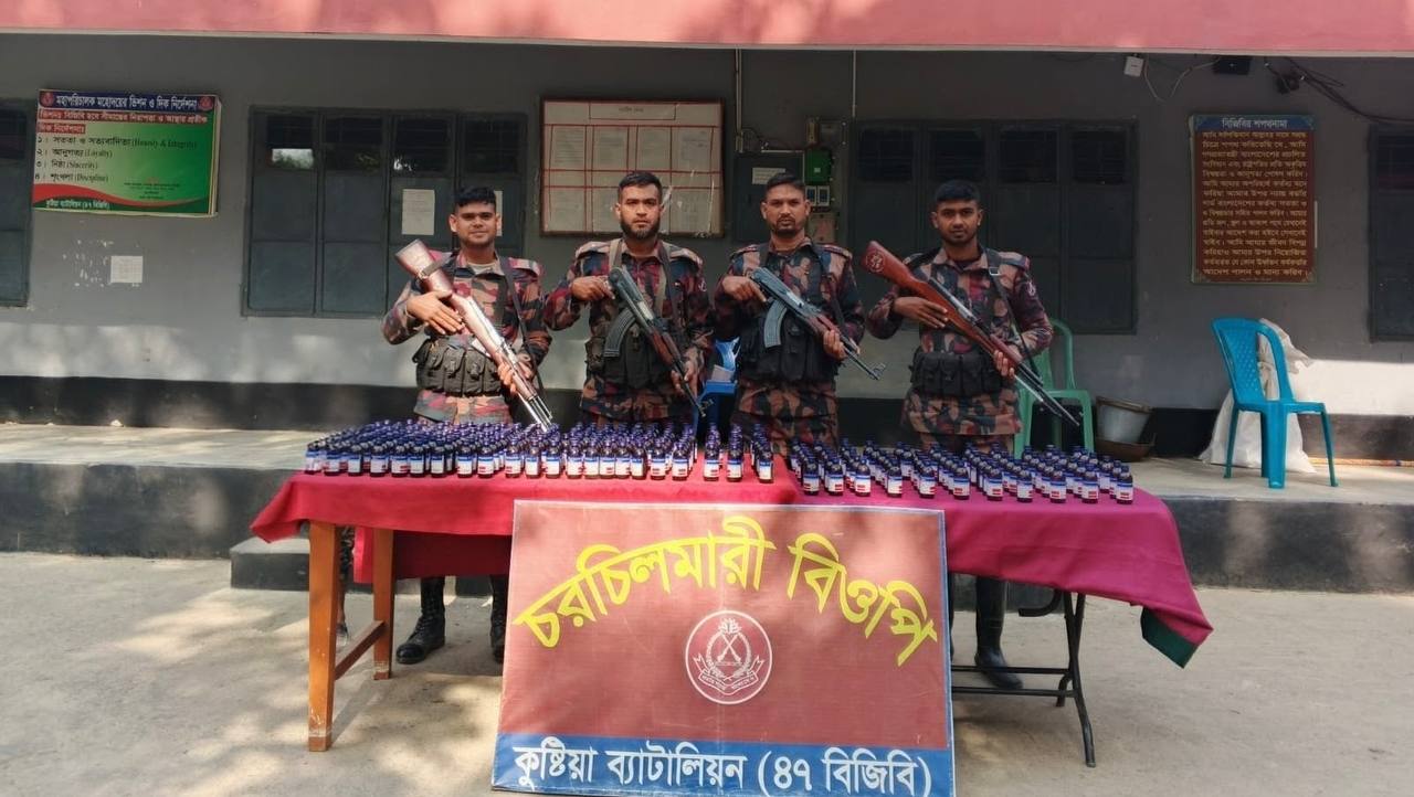 এ ছাড়াও একই দিনে আনুমানিক দুপুর পৌনে ১টায় কুষ্টিয়া ব্যাটালিয়নের (৪৭ বিজিবি) চরচিলমারী বিওপি এলাকার সীমান্ত পিলার ৮৪/২-এস থেকে আনুমানিক ১০ গজ বাংলাদেশ অভ্যন্তরে ডিগ্রীর চর মাঠপাড়া এলাকা থেকে নায়েক মোঃ মিজানুর রহমানের নেতৃত্বে বিশেষ টহল দল অভিযান পরিচালনা করেন। অভিযানে মালিকবিহীন অবস্থায় ভারতীয় ইএসকেইউএই নামে ১৭৭ বোতল সিরাপ ঞ্জব্দ করা হয়। যার আনুমানিক মূল্য ১ লাখ ১০ হাজার ৮০০ টাকা।