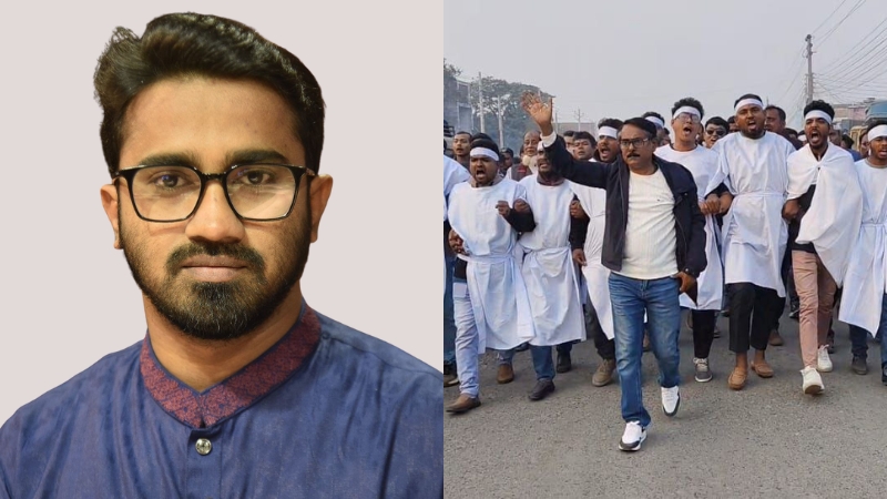 শুক্রবার (২৬ ডিসেম্বর) বিকেলে বিএনপির কয়েক হাজার নেতাকর্মী কাফনের কাপড় পরে বিক্ষোভ মিছিল করেন। এ সময় তারা, 'রাশেদের চামড়া তুলে নেব আমরা', 'ঝিনাইদহে-২ এ ফিরে যা, নইলে চামড়া থাকবে না' ও 'বহিরাগতদের আস্তানা এই আসনে হবে না'- বলে শ্লোগান দিতে থাকেন।
