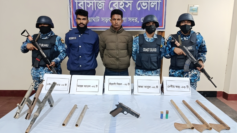 কোস্ট গার্ডের মিডিয়া কর্মকর্তা লেফটেন্যান্ট কমান্ডার সিয়াম উল-হক জানান, গোপন সংবাদের ভিক্তিতে রোববার ভোর ৪টার দিকে কোস্ট গার্ডের ভোলা বেইস ও পুলিশের সমন্বয়ে ভোলার সদর থানাধীন শরীফ বাজার সংলগ্ন এলাকায় একটি যৌথ অভিযান পরিচালনা করা হয়। অভিযান চালিয়ে একটি বিদেশী পিস্তল, তিনটি দেশীয় আগ্নেয়াস্ত্র, দুইটি দেশীয় আগ্নেয়াস্ত্রের ব্যারেল, তিনটি দেশীয় অস্ত্র ও দুই রাউন্ড কার্তুজসহ মো. রাসেলকে আটক করা হয়।