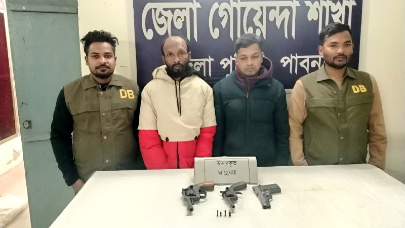 পাবনা ডিবি পুলিশের ওসি রাশেদুল ইসলাম এ তথ্য নিশ্চিত করে জানান, গোপন সংবাদের ভিত্তিতে শহরের মনসুরাবাদ এলাকায় অভিযান চালিয়ে একটি বিদেশি পিস্তল, দুটি রিভলবারসহ চার রাউন্ড তাজা কার্তুজ উদ্ধার করা হয়। এ সময় দুইজনকে আটক করা হয়।