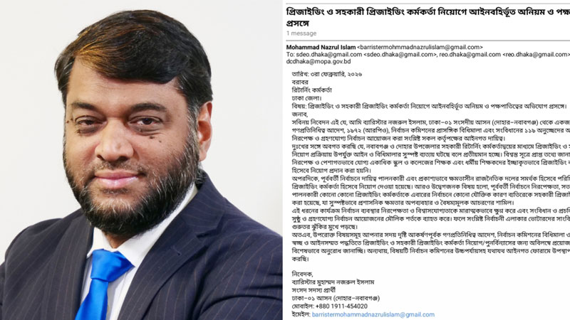 লিখিত অভিযোগে তিনি উল্লেখ করেন, গণপ্রতিনিধিত্ব আদেশ (আরপিও) ১৯৭২, নির্বাচন কমিশনের বিধিমালা এবং সংবিধানের ১১৯ অনুচ্ছেদ অনুযায়ী একটি অবাধ, সুষ্ঠু ও নিরপেক্ষ নির্বাচন আয়োজন করা সংশ্লিষ্ট কর্তৃপক্ষের আইনগত দায়িত্ব। কিন্তু, বাস্তবে দোহার ও নবাবগঞ্জ উপজেলায় প্রিজাইডিং ও সহকারী প্রিজাইডিং কর্মকর্তা নিয়োগের ক্ষেত্রে সেই আইনি কাঠামো উপেক্ষা করা হচ্ছে।