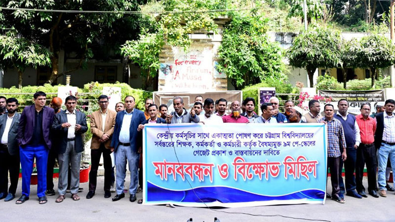 চট্টগ্রাম বিশ্ববিদ্যালয়ে (চবি) বৈষম্যমুক্ত নবম পে স্কেলের গেজেট প্রকাশ ও বাস্তবায়নের দাবিতে সর্বস্তরের শিক্ষক, কর্মকতা, কর্মচারীর ব্যানারে মানববন্ধন ও বিক্ষোভ মিছিল অনুষ্ঠিত হয়েছে।