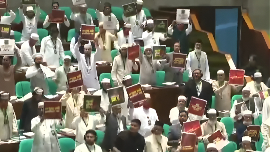 প্ল্যাকার্ডে লেখা—‘জুলাই নিয়ে গাদ্দারি চলবে না’, ‘জুলাইয়ের সঙ্গে বিশ্বাসযোগ্যতা বন্ধ কর’সহ বিভিন্ন স্লোগান। এ সময় সবাইকে শান্ত থাকতে আহ্বান জানান স্পিকার।