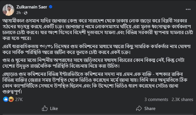 ইনকিলাব মঞ্চের মুখপাত্র শরিফ ওসমান হাদির জানাজাকে কেন্দ্র করে সারাদেশ থেকে ঢাকায় লোক জড়ো করে বিপ্লবী সরকার গঠনের ষড়যন্ত্র করছে একটি চক্র—এমন আশঙ্কার কথা জানিয়েছেন সাংবাদিক জুলকারনাইন সায়ের।