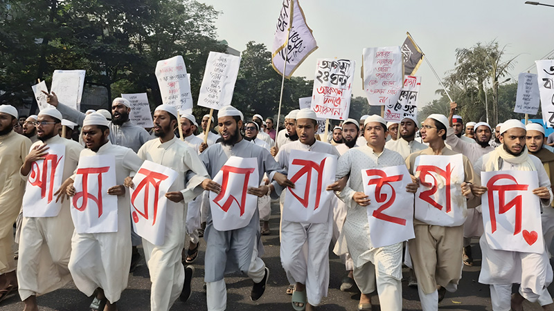 শনিবার (২০ ডিসেম্বর) সকাল সাড়ে ১০টায় সরেজমিনে দেখা যায়, মিছিল থেকে ‘আমরা সবাই হাদি হবো যুগে যুগে লড়ে যাবো’, ‘হাদি ভাইয়ের রক্ত বৃথা যেতে দেব না’, ইত্যাদি স্লোগান দেওয়া হচ্ছে।