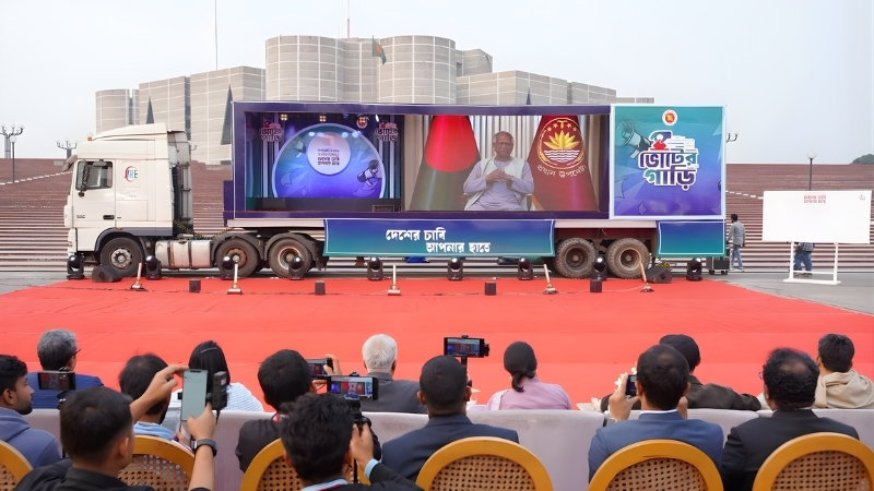 ‘ভোটের গাড়ি’ প্রসঙ্গে অধ্যাপক ইউনূস বলেন, এই সুপার ক্যারাভান কেবল একটি গাড়ি নয়, এটি গণতন্ত্রের আনন্দ বাণী বহনকারী বহর। এটি জানিয়ে দেবে, আপনার একটি ভোট কতটা গুরুত্বপূর্ণ। এটা মনে করিয়ে দেবে নিষ্ক্রিয়তা নয়, অংশগ্রহণই গণতন্ত্রকে শক্তিশালী করে।