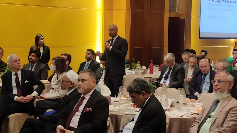 এর আগে সকাল ১০টা থেকে দ্যা ওয়েস্টিনের বলরুমে আসন্ন জাতীয় সংসদ নির্বাচন ও গণভোট, ২০২৬ উপলক্ষে বাংলাদেশে অবস্থিত দূতাবাস ও মিশনে কর্মরত সব বিদেশি কূটনীতিকের সঙ্গে বৈঠকে বসে নির্বাচন কমিশন। সেখানে উপস্থিত ছিলেন নির্বাচন কমিশনার আব্দুর রহমানেল মাছউদ, বেগম তাহমিদা আহমদ, মো. আনোয়ারুল ইসলাম সরকার, ব্রিগেডিয়ার জেনারেল আবুল ফজল মো. সানাউল্লাহ (অব.), ইসি সচিবালয়ের সিনিয়র সচিব আখতার আহমেদসহ নির্বাচন কমিশনের উচ্চপদস্থ কর্মকর্তারা। এ ছাড়া বিভিন্ন দেশের রাষ্ট্রদূত, হাইকমিশনার, ইউরোপীয় ইউনিয়ন ও জাতিসংঘের প্রতিনিধিরা এতে অংশগ্রহণ করেন।