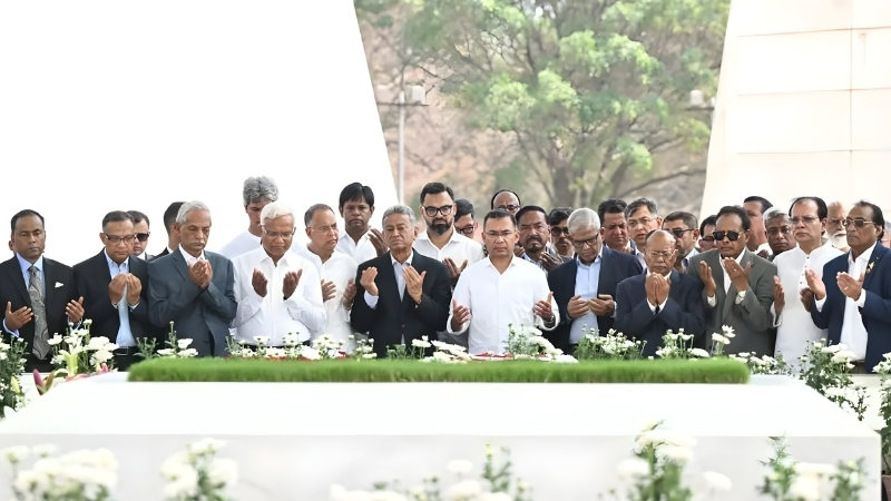 এর আগে, বেলা ১১টার দিকে সাভারের জাতীয় স্মৃতিসৌধে মহান মুক্তিযুদ্ধের বীর শহীদদের প্রতি শ্রদ্ধা নিবেদন করেন প্রধানমন্ত্রী তারেক রহমান। প্রধানমন্ত্রী হিসেবে শ্রদ্ধা জানানোর শেষে তিনি নবগঠিত মন্ত্রিপরিষদের সদস্যদের সঙ্গে নিয়ে স্মৃতিসৌধের বেদিতে পুষ্পস্তবক অর্পণ করেন। এরপর স্মৃতিসৌধের পরিদর্শন বইয়ে দেশের ১১তম প্রধানমন্ত্রী হিসেবে সই করেন। সেই সঙ্গে প্রচলন মেনে স্মৃতিসৌধ প্রাঙ্গণে বৃক্ষরোপণও করেন তারেক রহমান।