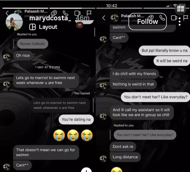 স্ক্রিনশটে দেখা যায় ম্যারি ডি’কোস্তা নামে এক নারী ও পলাশের কথোপকথন। ওই নারীই তার ইনস্টাগ্রাম অ্যাকাউন্টে এ সব স্ক্রিনশট শেয়ার করেছেন। যেখানে পলাশকে তার রূপের প্রশংসা করতে দেখা গিয়েছে। এছাড়া ম্যারি ডি’কোস্তার সঙ্গে দেখা করে সাঁতারও কাটতে চান পলাশ।