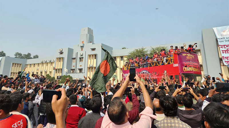 কাজলা গেট দিয়ে ঢুকে প্যারিস রোড ও জোহা চত্বর প্রদক্ষিণ করে মেইন গেট দিয়ে বের হয়ে যাওয়ার সময় শিক্ষার্থীদের উচ্ছ্বাস চোখে পড়ার মতো ছিল। বাসের সামনে-পেছনে জমে থাকা ছাত্রছাত্রীরা খেলোয়াড়দের কাছ থেকে অটোগ্রাফ এবং জার্সি নিতে ব্যস্ত ছিলেন। আবার খেলোয়াড়রাও হেসে-হেসে জার্সি ছুঁড়ে দিয়েছেন।