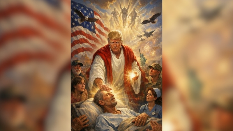 রোববারের পোস্টে ট্রাম্পকে সাদা পোশাকে এক ব্যক্তির মাথায় হাত রেখে ‘আরোগ্য দান’-এর ভঙ্গিতে দেখা যায়। ছবিতে তার এক হাতে উজ্জ্বল গোলক ছিল এবং পেছনে স্ট্যাচু অব লিবার্টি, যুদ্ধবিমান ও ঈগলের উপস্থিতি দেখা যায়।