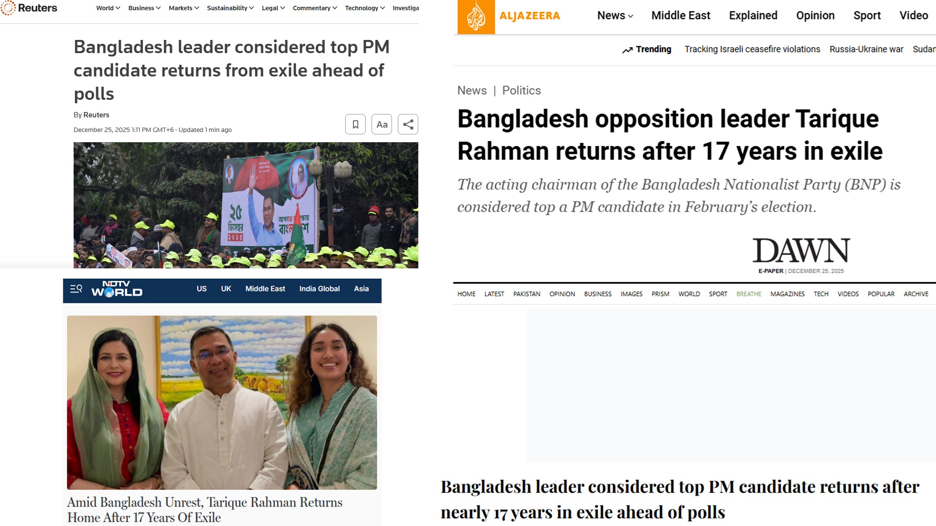 তারেক রহমানের দেশে ফেরা নিয়ে ব্রিটিশ বার্তা সংস্থা রয়টার্সের শিরোনাম ‘নির্বাচনের আগে দেশে ফিরলেন বাংলাদেশের সম্ভাব্য প্রধানমন্ত্রী প্রার্থী’।