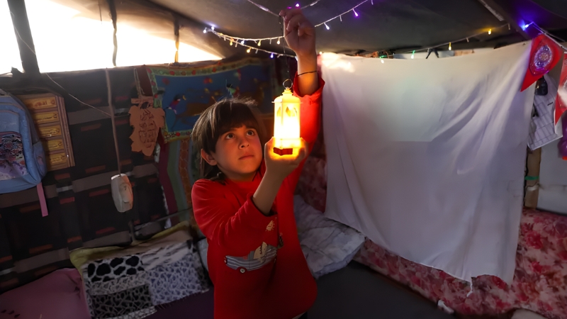 মধ্য গাজার বুরেজ শরণার্থী শিবিরে একটি তাঁবুতে বসে পবিত্র রমজান মাসকে স্বাগত জানান মাইসুন আল-বারবারাউই। পবিত্র এই মাসের আগমন উপলক্ষে শরণার্থী শিবিরের বাসিন্দারা তাদের জীর্ণ তাঁবু সাজিয়েছেন। কাপড়ের দেয়ালে এঁকেছেন রঙ-বেরঙের ছবি।