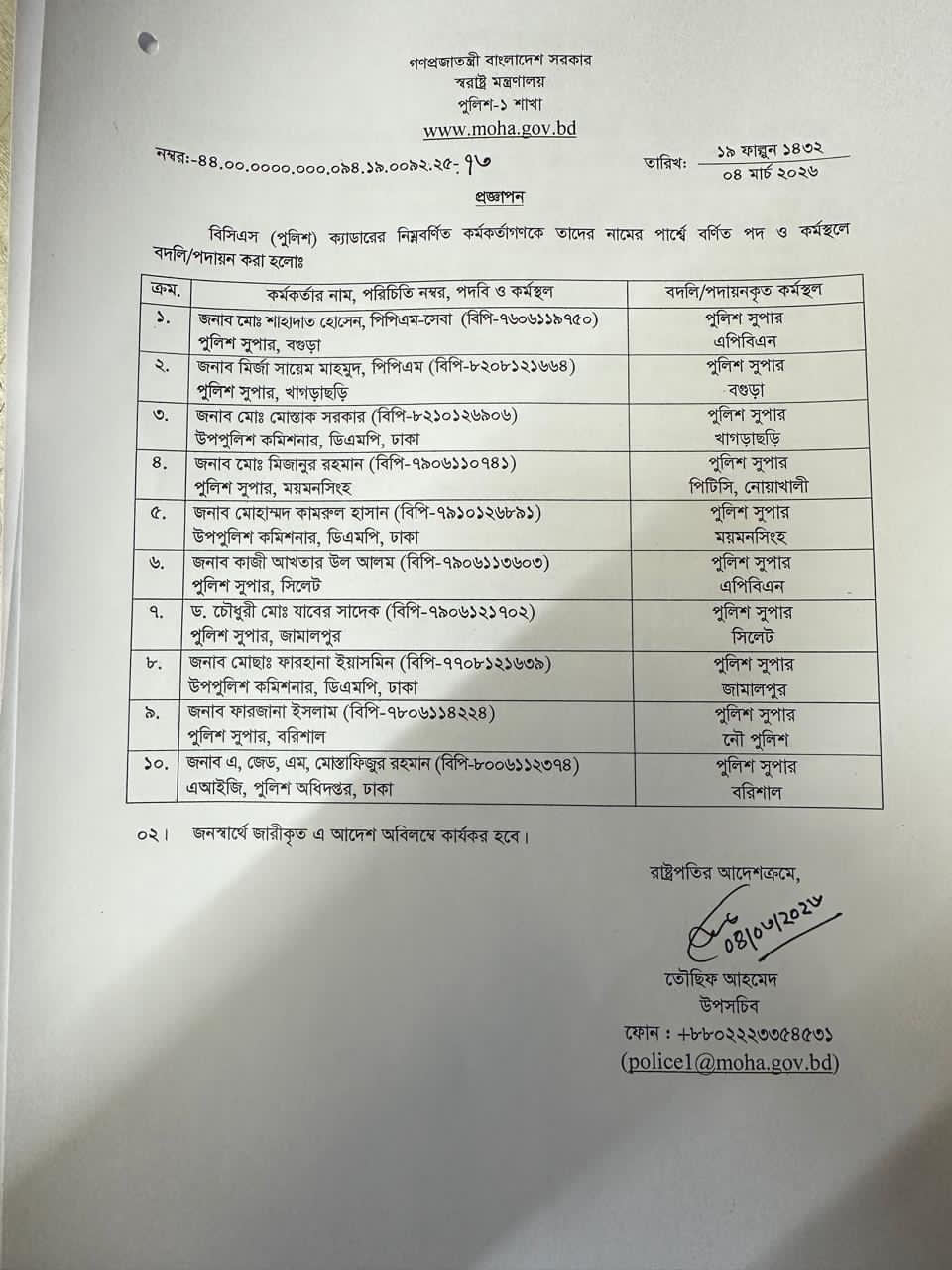 এতে বগুড়ার পুলিশ সুপার মো. শাহাদাত হোসেনকে আর্মড পুলিশ ব্যাটালিয়নের (এপিবিএন) পুলিশ সুপার করা হয়েছে। পাশাপাশি খাগড়াছড়ির পুলিশ সুপার মির্জা সায়েম মাহমুদকে বগুড়ার পুলিশ সুপার এবং ঢাকা মেট্রোপলিটন পুলিশের (ডিএমপি) উপপুলিশ কমিশনার মো. মোস্তাক সরকারকে খাগড়াছড়ির পুলিশ সুপার করা হয়েছে।