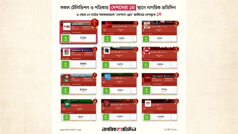 নাগরিক প্রতিদিনে সোশ্যাল মিডিয়া ম্যানেজমেন্ট, সেন্ট্রাল, ন্যাশনাল, ইন্টারন্যাশনাল, স্পোর্টস, এন্টারটেইনমেন্ট, ক্রাইম, মার্কেটিংসহ প্রতিটি বিভাগের অবদানে ধারাবাহিকভাবে শীর্ষস্থান অর্জনের লক্ষ্য আরও দৃঢ় হচ্ছে।