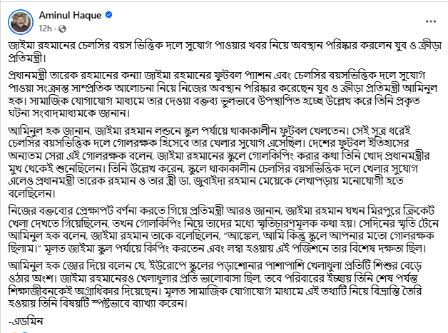 নিজের বক্তব্যের প্রেক্ষাপট ব্যাখ্যা করতে গিয়ে প্রতিমন্ত্রী একটি ব্যক্তিগত স্মৃতিও তুলে ধরেন। মিরপুরে এক ম্যাচ দেখতে গিয়ে জাইমার সঙ্গে তার গোলকিপিং নিয়ে কথা হয়েছিল। সেই সময় জাইমা তাকে বলেছিলেন, ‘আঙ্কেল, আমি কিন্তু স্কুলে আপনার মতো গোলরক্ষক ছিলাম।’