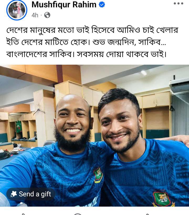 জন্মদিনে সাকিবকে ঘিরে ভক্ত-সমর্থকদের পাশাপাশি শুভেচ্ছা জানিয়েছেন সতীর্থরাও। দীর্ঘদিন একসঙ্গে দেশের হয়ে খেলা মুশফিকুর রহিম তার জন্য আবেগঘন বার্তা দিয়েছেন। তিনি বলেছেন, দেশের মানুষের মতো তিনিও চান সাকিব যেন নিজের ক্যারিয়ারের ইতি টানতে পারেন দেশের মাটিতেই।