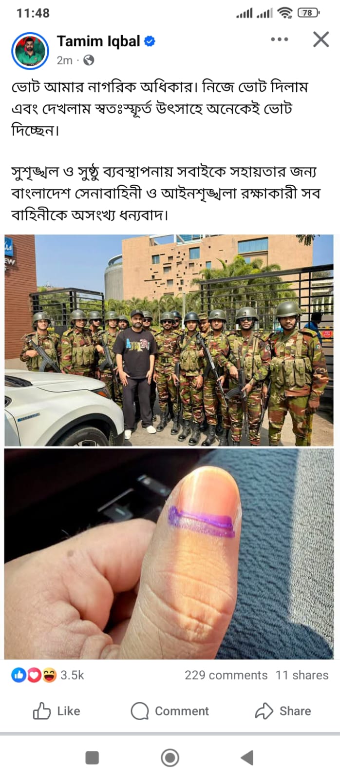 ভোট দিয়ে আসার পর তামিম তার ভেরিফায়েড ফেসবুক পেজে লেখেন, ‘ভোট আমার নাগরিক অধিকার। নিজে ভোট দিলাম এবং দেখলাম স্বতঃস্ফূর্ত উৎসাহে অনেকেই ভোট দিচ্ছেন।’