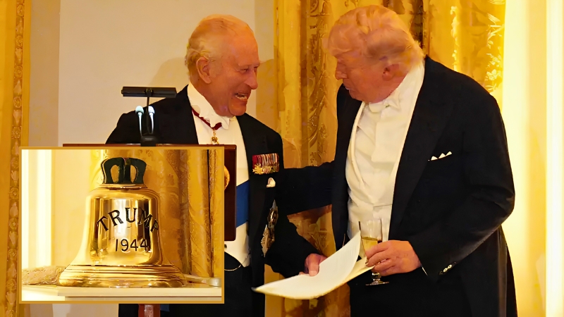 রাজা চার্লস যুক্তরাষ্ট্রের প্রেসিডেন্টকে একটি বিশেষ উপহার দিয়েছেন, যেটি এই দুই দেশের সামরিক জোটের গুরুত্বকেও তুলে ধরে। তিনি তাকে ‘এইচএমএস ট্রাম্প’ নামের একটি যুদ্ধকালীন সাবমেরিনের আসল ঘণ্টাটি উপহার দেন। ১৯৪৪ সালে প্রথম চালু হওয়া রাজকীয় নৌবাহিনীর সাবমেরিনের টাওয়ারের ঘণ্টা এটি।